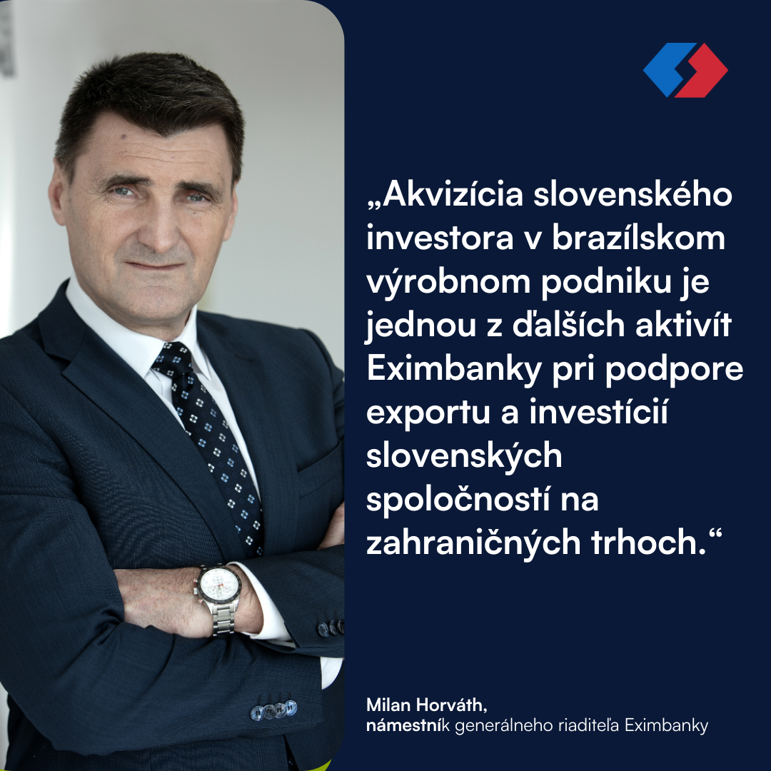 The acquisition of a Slovak investor in a Brazilian manufacturing company is one of the other activities of EXIMBANKA SR in supporting exports and investments of Slovak companies in foreign markets. The project is a continuation of previous successful transactions supported by EXIMBANKA SR, such as the insurance of a buyer’s credit for the export of measuring equipment of Betamont,a. s., Zvolen to Uzbekistan in November 2025 in the amount of almost EUR 10 million,” concluded Milan Horváth, Deputy Director General of EXIMBANKA SR for Insurance.