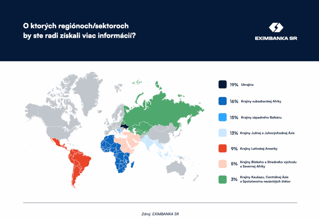 According to Eximbanka’s research, there is a growing interest in Ukraine (19%), sub-Saharan Africa (16%) and the Western Balkans (15%). Companies are also attracted to Southeast Asia and Latin America, but they face a lack of contacts, financial security and unfamiliarity with the territories when expanding.